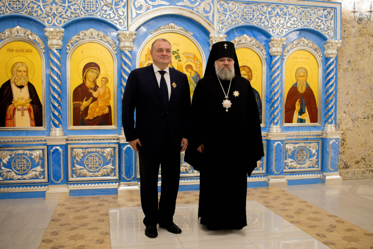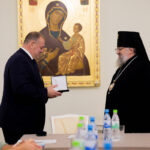 Далее архиепископ Никанор вручил знак и удостоверение действительного члена Императорского Православного Палестинского Общества иеромонаху Аполлинарию (Обухову), руководителю Административного секретариата Южно-Сахалинской и Курильской епархии, настоятелю Воскресенского собора г. Южно-Сахалинска.