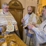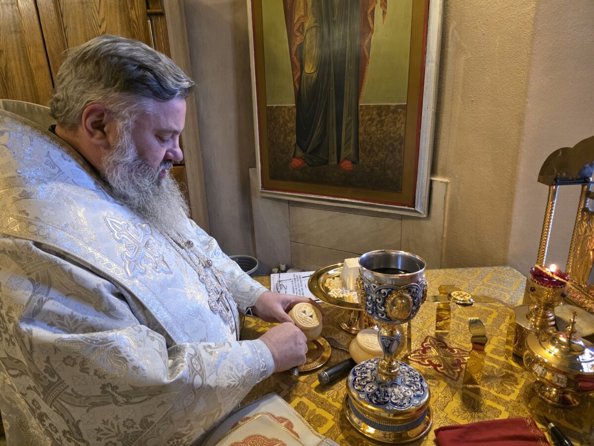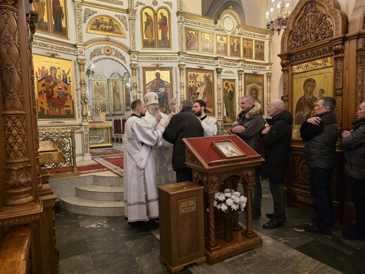 Его Высокопреосвященству сослужили секретарь епархии, настоятель Воскресенского собора иеромонах Аполлинарий (Обухов), благочинный Южно-Сахалинского городского округа, настоятель Никольского храма г. Южно-Сахалинска протоиерей Павел Алексеев, настоятель Покровского храма г. Александровск-Сахалинский игумен Амвросий (Ковалев), заведующий канцелярией Южно-Сахалинского епархиального управления иеромонах Лавр (Немодин), настоятель Пантелеимоновского храма с. Синегорье иерей Александр Попов, епархиальное духовенство.